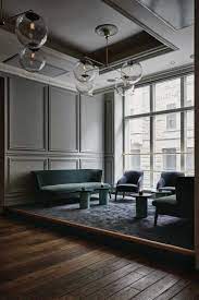 Furniture offers smooth clean lines inspired by architecture from the 1930s. The focus is on simplicity cleanliness and absence of decor or detailing. The light is distributed evenly which gives the interior a finished look.